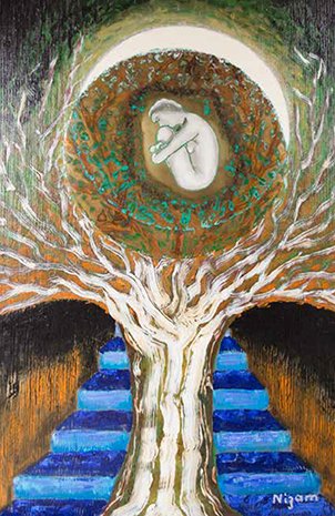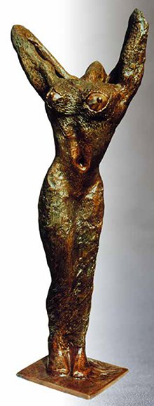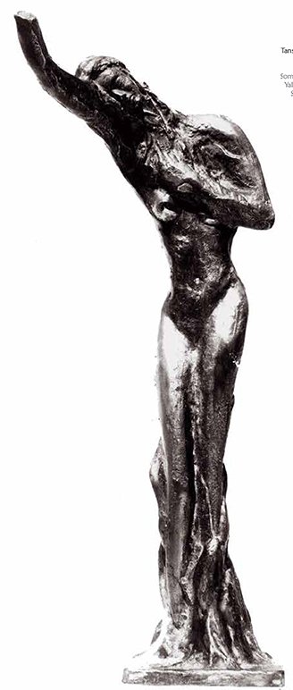 Ce que ne dit pas l'arbre complet avec ses racines plongeant dans l'empire des morts et sa frondaison du ciel voisine, la tête endormie à la souple chevelure, le dit symboliquement. Au point crucial où une horizontale vient barrer une vericale se fait dans le silence un rêve d'immortalité.